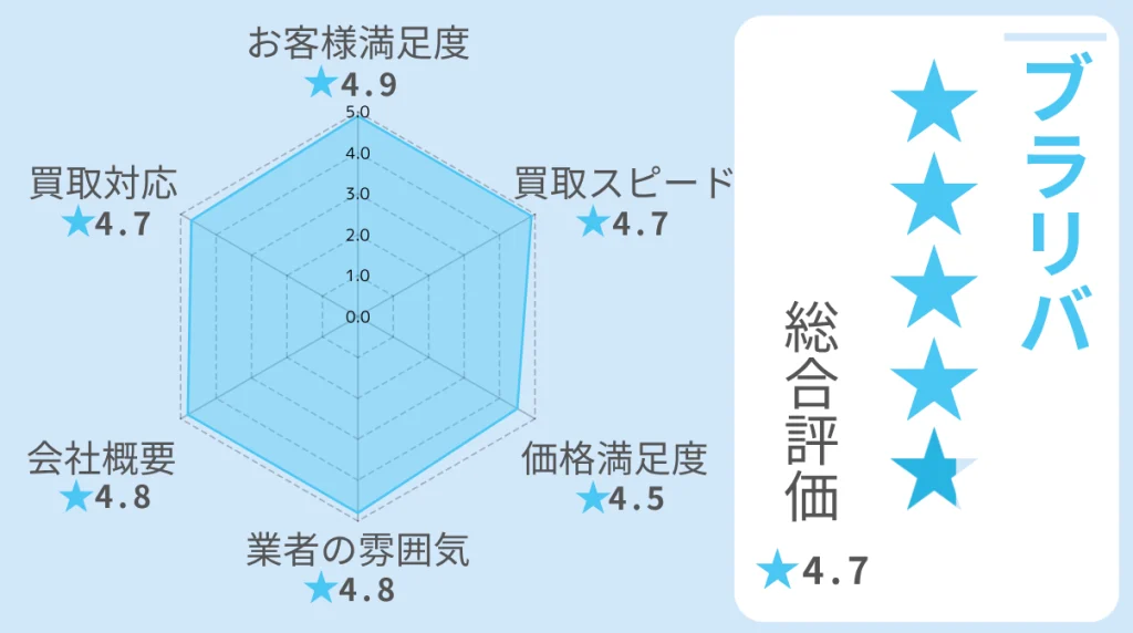 総合評価では「ブラリバ」がおすすめ。豊富な買取方法持ち、ブランド品の取り扱いにもたけています。スピーディな対応で現金化までの流れがスムーズな点もポイントです。