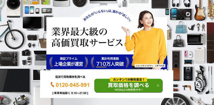 店頭買取、出張買取に対応しており、査定料、出張料などはすべて無料。ユーザーにとって安心感が高い買取業者です。