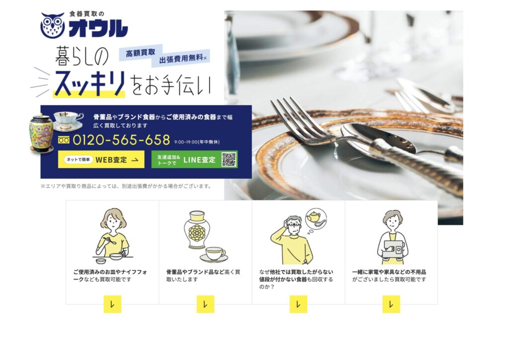 食器に精通した査定士が在籍し、汚れ・傷・日焼けなどがある食器でも査定可能で、「価値がないだろう」と諦める前に相談できる点が大きな魅力です。