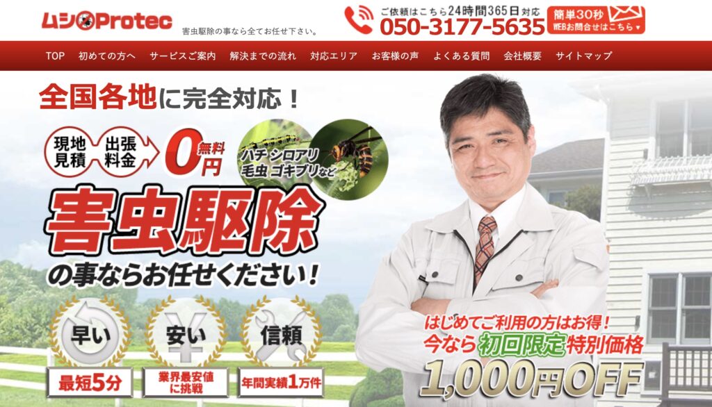 ムシプロテックは、年間3万件以上の害虫・害獣駆除実績を誇る全国対応の駆除業者です。24時間365日コールセンターでの受付対応を行い、専門の技術スタッフと特殊機材を駆使して様々な害虫駆除に対応しています。