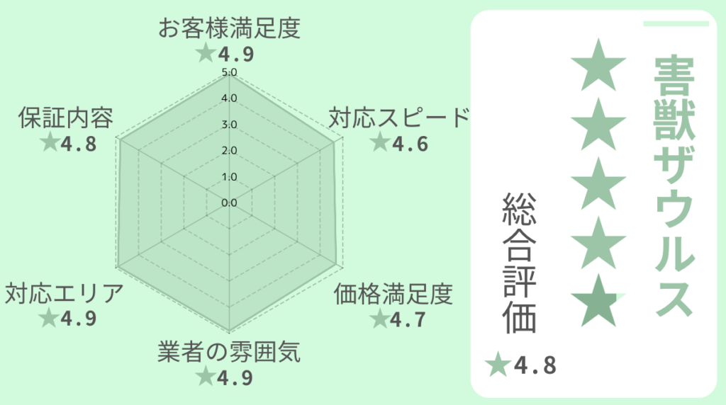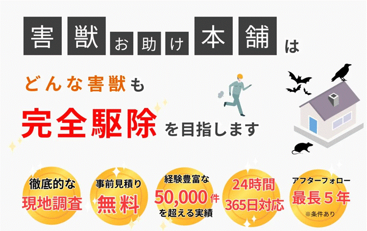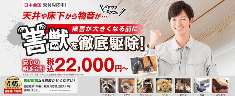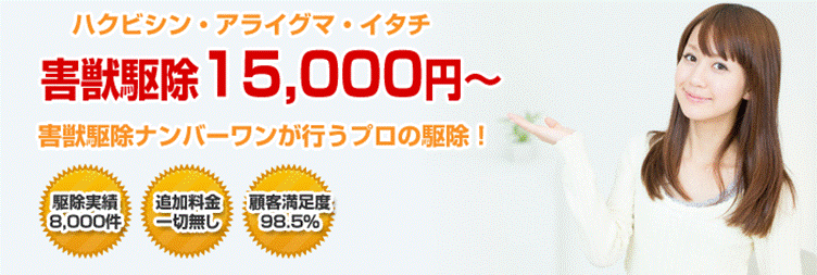 | 費用例 | ハクビシン25,000円~、ネズミ25,000円~、コウモリ25,000円~、トコジラミ2,200円/㎡~ |
