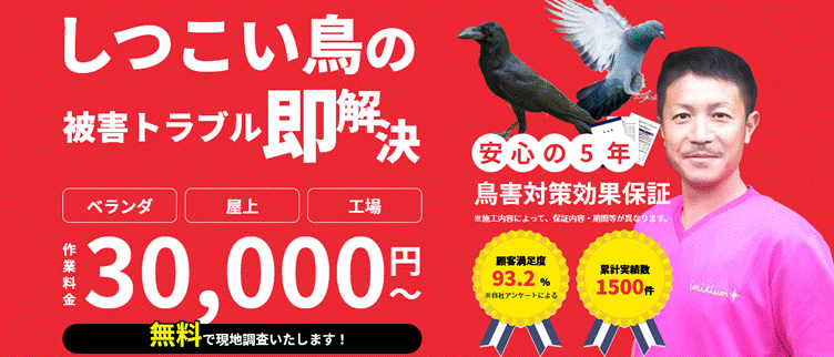 | 対応害獣・害虫 | ネズミ、シロアリ、ゴキブリ、ハト、チョウバエ、クモなど |