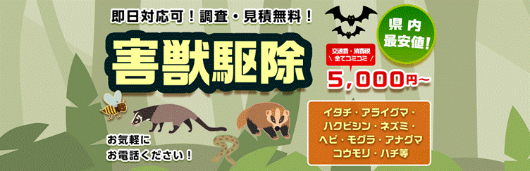 | 費用例 | ネズミ:22,000円~、イタチ:39,600円~、ハクビシン:33,000円~、アライグマ:49,500円~、モグラ:30,000円~、害鳥:22,000円~、コウモリ:22,000円~ |