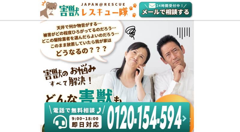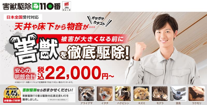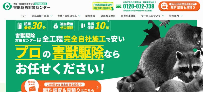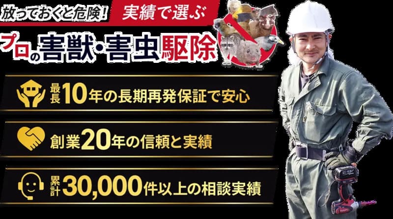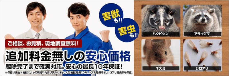 | 対応害獣・害虫 | ネズミ、ハクビシン、イタチ、コウモリ、シロアリなど幅広く対応 |