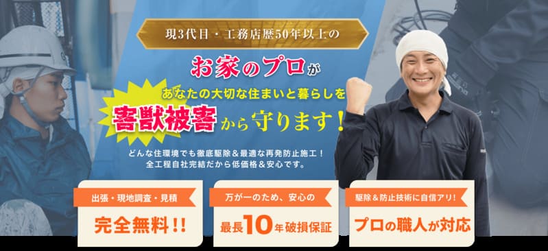 害獣プロテックは、創業50年以上のリフォーム会社を母体とし、工務店としての技術力を活かした害獣・害虫駆除を提供する業者です。