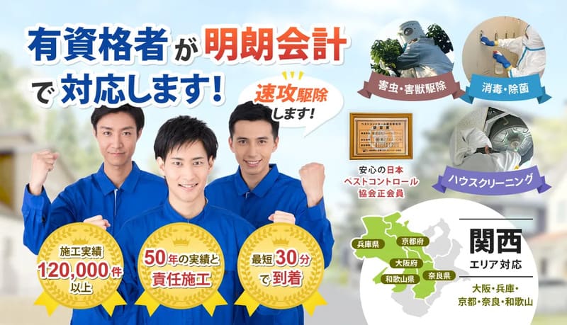 日本有害鳥獣駆除・防除管理協会加盟で、協会認定の専用薬剤を用いた施工が特徴です。