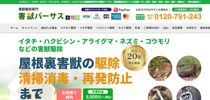 | 対応害獣・害虫 | ハクビシン、ネズミ、コウモリ、イタチ、アライグマ、ムササビ、アナグマ、ハチ、シロアリ ほか |