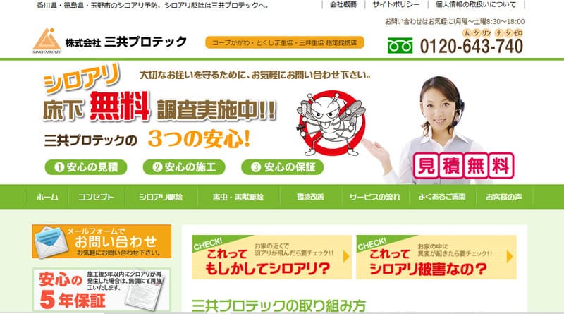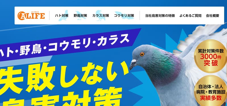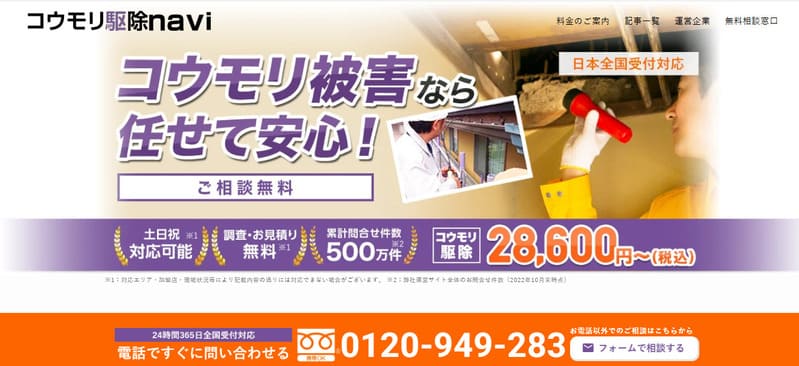 「現地調査・見積もり無料」「追加料金なしのコミコミ価格」「駆除後の殺菌・消毒・清掃まで含めた安心の施工」と、依頼者にとっての安心材料が多く揃っています。
