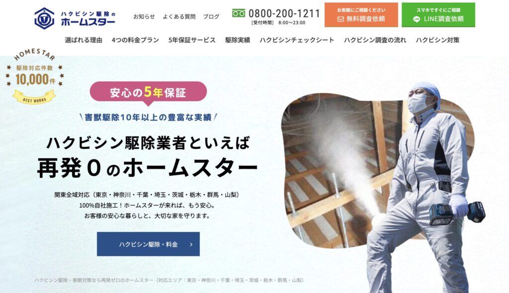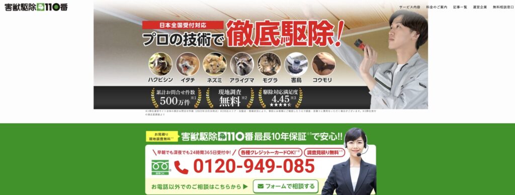 また、コールセンターから調査見積り、駆除作業まですべて正社員が担当する自社完結型のため、中間コストが発生せずリーズナブルな価格設定を実現しているといえるでしょう。