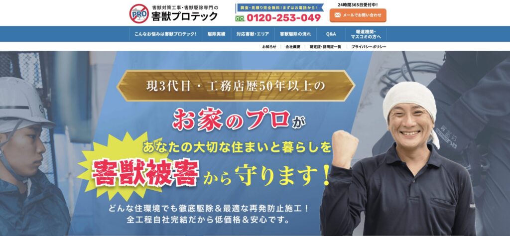 害獣プロテックは、1950年設立の花輪工務店を母体とする害獣駆除専門業者で、建築のプロとしての50年以上の実績とハクビシン駆除の専門知識を併せ持つ企業です。