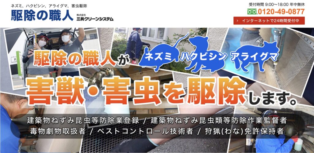 特許取得済みの専用薬剤を使用し、日本害獣対策ガイドライン協会公認の安全な除菌作業を実施している点が特徴的です。ハクビシンの生態を熟知した効果的な駆除が期待できます。
