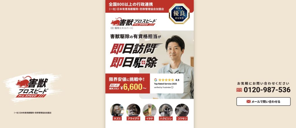 関東・関西・東海・九州エリアに対応し、調査から施工まですべて正社員による自社完結型のサービスを提供しており、ハクビシンの帰巣本能に対抗する侵入経路封鎖に特に力を入れています。