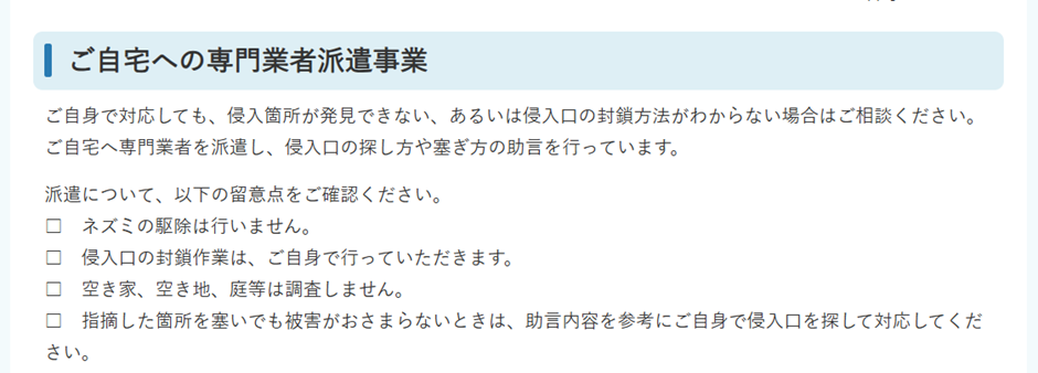 例えば東京都や大阪市など一部自治体では、害虫・害獣駆除について相談に乗る制度を設けています。また自治体によっては専門業者を派遣して、状況をお無料でチェックしてくれる場合も。