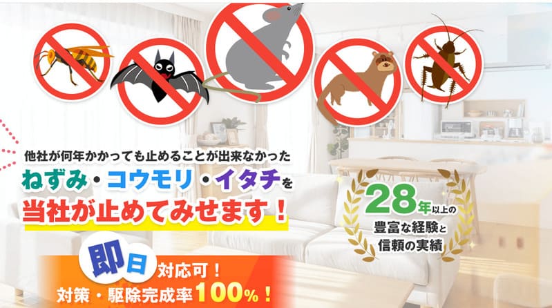 | 対応害獣・害虫 | ネズミ・ハクビシン・イタチ・アライグマ・コウモリほか害虫も対応 |