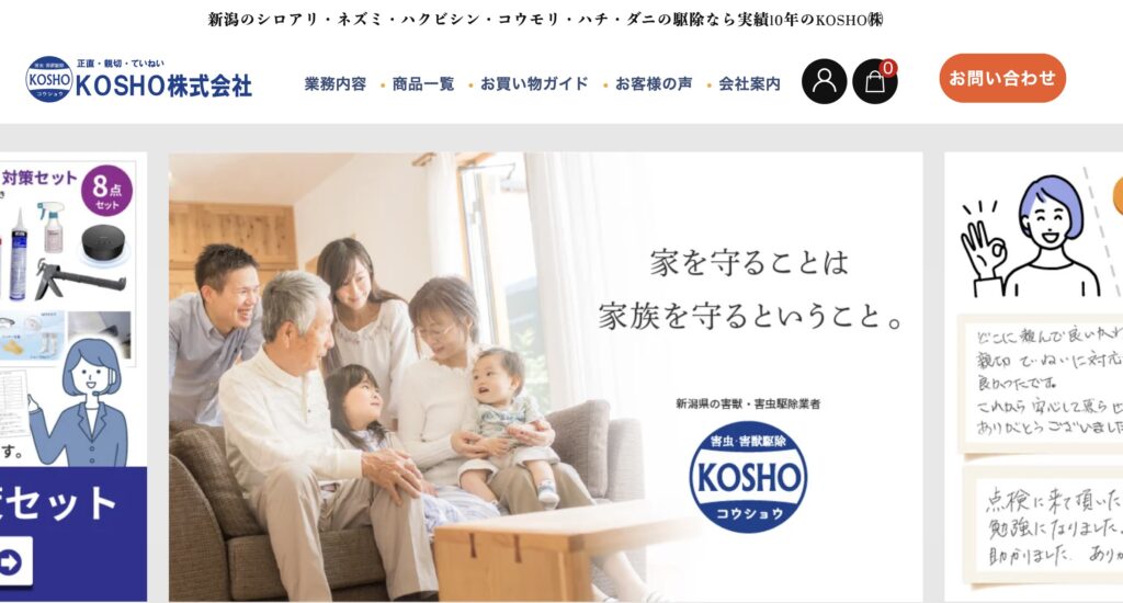 KOSHO株式会社は、新潟県五泉市に本社を構える実績10年の地域密着型害獣・害虫駆除業者です。シロアリ駆除を主力とし、コウモリ駆除にも対応しており、新潟県内の下越地方、中越地方、上越地方の全域をサポートエリアとしています。