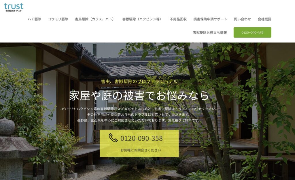 | 対応害獣・害虫 | ハクビシン、イタチ、アライグマ、ネズミ、コウモリ、トコジラミ、シロアリなど |