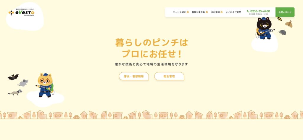 営業時間は8:00~18:00(不定休)で、24時間メールフォームでの受付も行っています。「安全性」と「効果」を両立した薬剤を使用し、お客様の被害状況に合わせて複数の薬剤を使い分けて施工を行います。