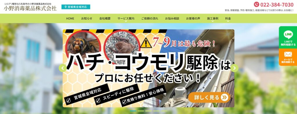 宮城県内では、亘理町や利府町の公式ホームページでも宮城県ペストコントロール協会(電話番号:022-366-1339)への相談を推奨しています。
