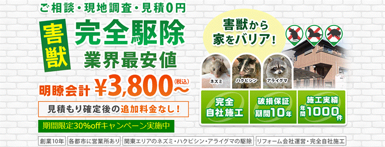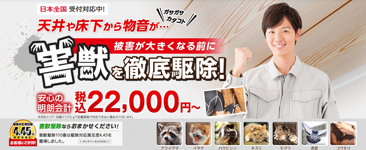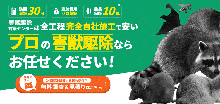 また、完全自社施工のため、中間マージンは一切不要。原則として、見積もり以外に追加費用も掛からない安心の料金体系で、リーズナブルに害獣を駆除できます。