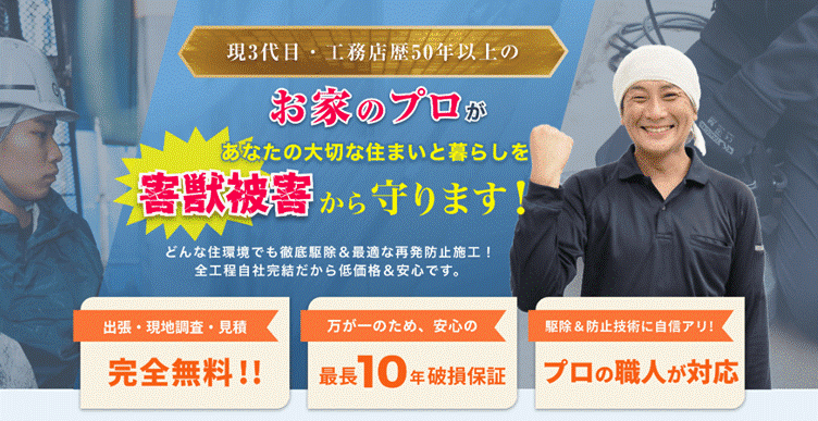 高評価の理由は、満足度の高いサービスによるもの。駆除をはじめ、侵入経路封鎖による再発防止や最長10年の再発保証など質の高い施工が魅力です。