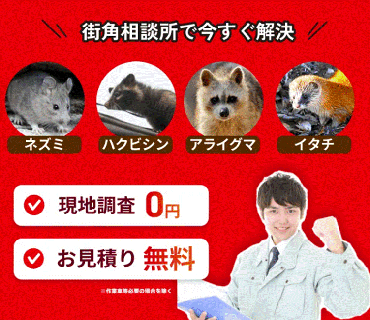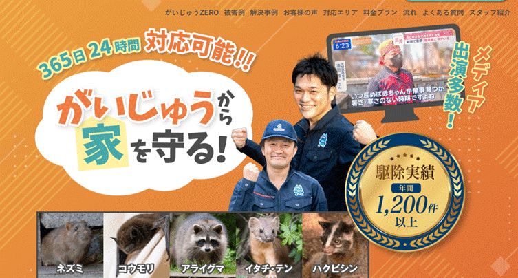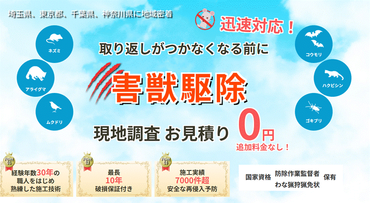 | 対応害獣・害虫 | アライグマ、ネズミ、ハクビシン、コウモリ、イタチなど |