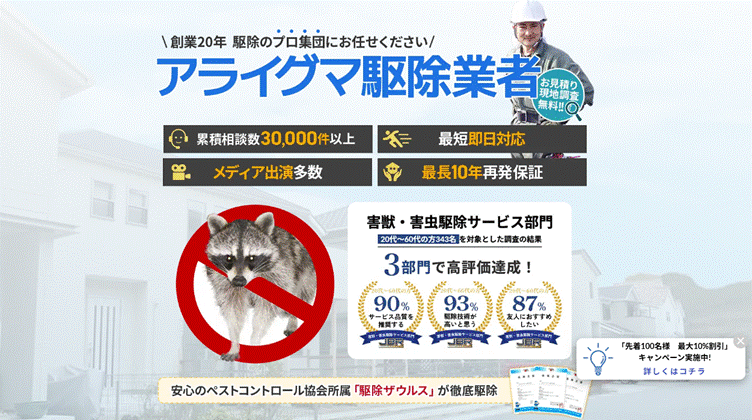 2025年9月現在、ホームページから問い合わせることで駆除代金が20%OFFになるクーポンが利用できます。もし、費用が思ったより高いと思っても、クーポンでお得に利用できるかもしれません。