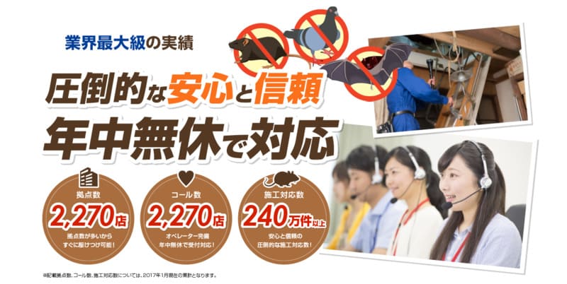 「ハウスプロテクト」「害獣駆除110番」「駆除ザウルス」といった全国対応の業者は、24時間365日受付で即日対応に力を入れています。