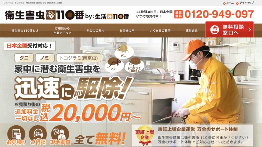 衛生害虫110番は、東証上場企業シェアリングテクノロジー株式会社が運営するダニ駆除サービスです。全国対応と24時間365日受付という利便性の高さが特徴といえるでしょう。
