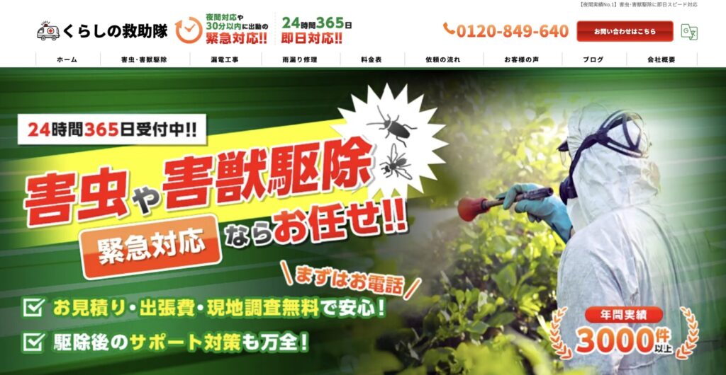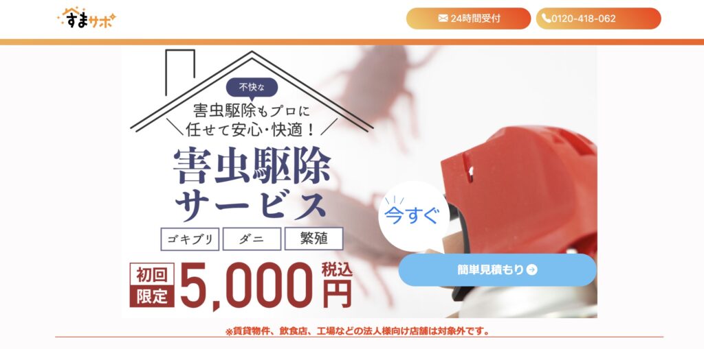 ダニ駆除が可能な業者を派遣し、速やかに駆除してくれます。24時間365日対応で迅速に快適な暮らしを取り戻せます。