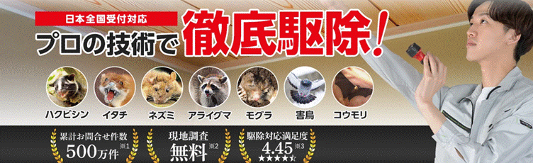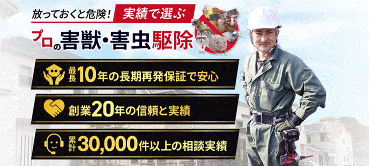 害獣駆除110番の強みは、全国規模の対応力と徹底した駆除への姿勢です。問い合わせから駆除完了までの流れが明確で、ユーザーが不安になりがちな料金や施工内容をわかりやすく説明。