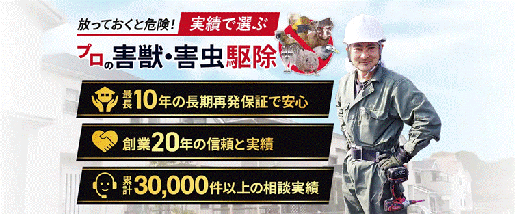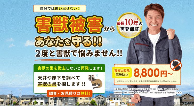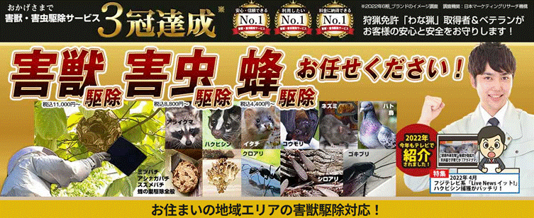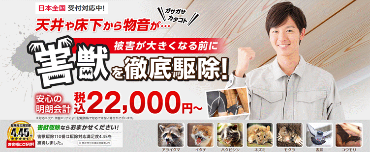| 費用例 | ハクビシン25,000円~、ネズミ25,000円~、コウモリ25,000円~、トコジラミ2,200円/㎡~ |