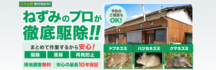 | 費用例 | ネズミ:22,000円~、イタチ:39,600円~、ハクビシン:33,000円~、アライグマ:49,500円~、モグラ:30,000円~、害鳥:22,000円~、コウモリ:22,000円~ |