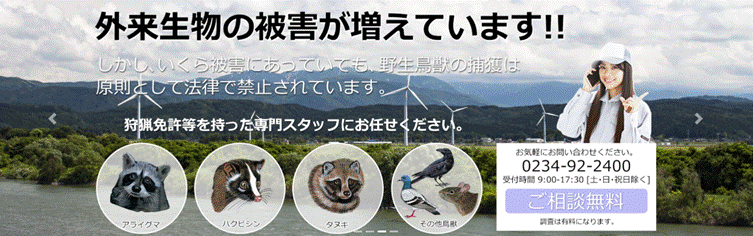 | 対応害獣・害虫 | アライグマ。ハクビシン、ネズミ、コウモリ、イタチ、ムクドリ、シロアリなど |