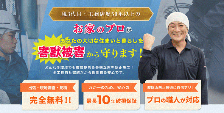 駆除費用、殺菌消毒費用、清掃費用がコミコミの分かりやすい料金体系と、安心の長期保証で害獣を徹底駆除してくれます。