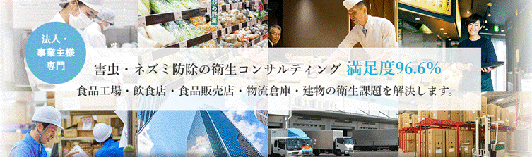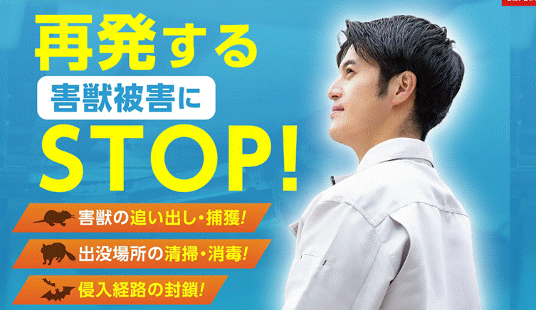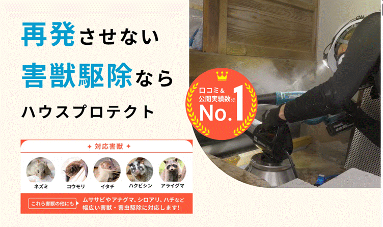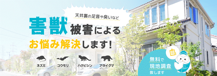| 費用例 | ハクビシン25,000円~、ネズミ25,000円~、コウモリ25,000円~、トコジラミ2,200円/㎡~ |