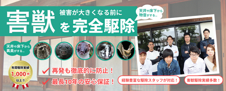 | 対応害獣・害虫 | アライグマ。ハクビシン、ネズミ、コウモリ、イタチ、ムクドリ、シロアリなど |