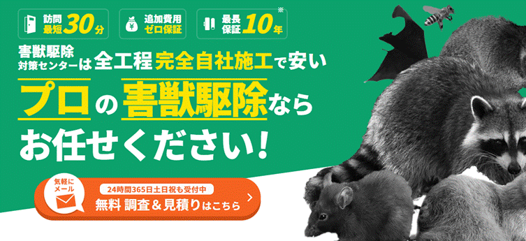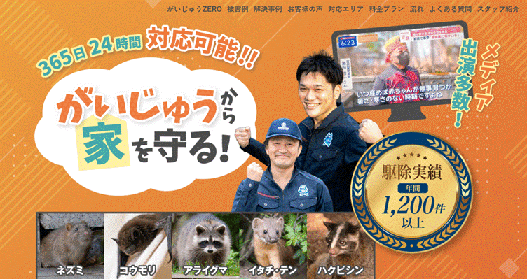 「害獣駆除110番」は全国でサービスを展開する害獣駆除業者です。24時間365日受付可能で、全国の加盟店が迅速に現地に駆け付けます。