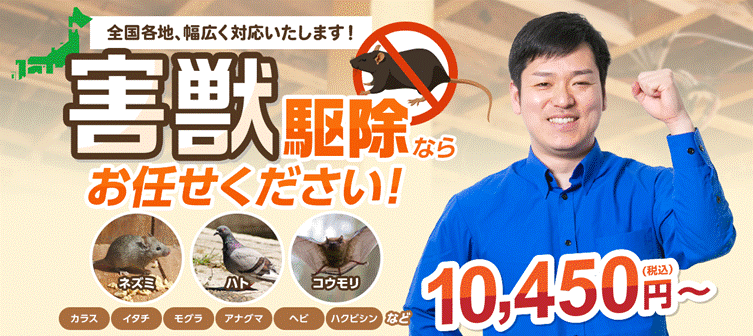 | 費用例 | ネズミ:22,000円~、イタチ:39,600円~、ハクビシン:33,000円~、アライグマ:49,500円~、モグラ:30,000円~、害鳥:22,000円~、コウモリ:22,000円~ |