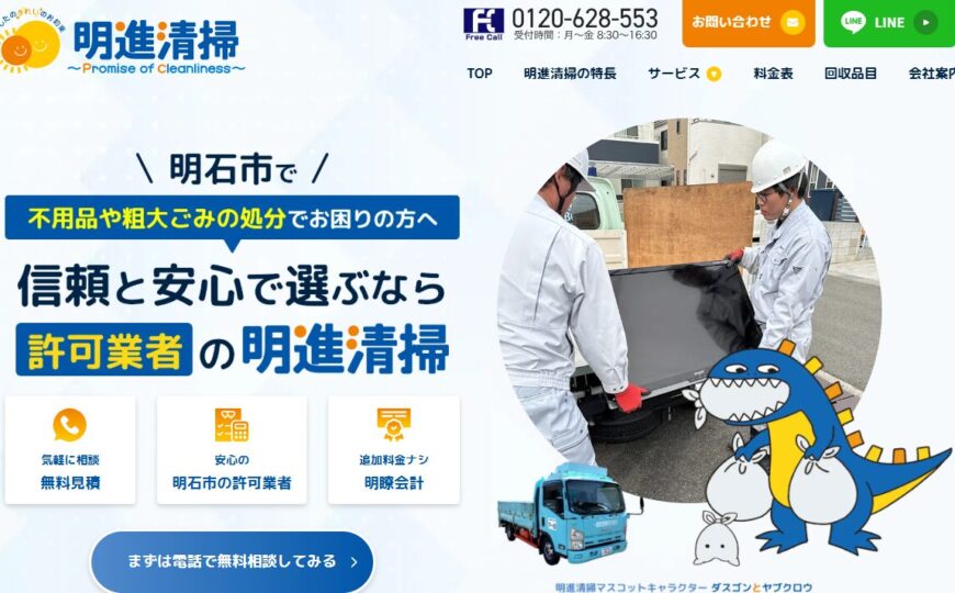 明石市で不用品回収や粗大ごみ処分なら許可業者の明進清掃にお任せください。不用品回収、粗大ごみの回収・処分、遺品整理、ゴミ屋敷清掃、家具の回収・処分、家電の回収・処分の幅広いサービスに対応しています。明石市で信頼と安心で選ぶなら許可業者の明進清掃にお気軽にご相談ください。